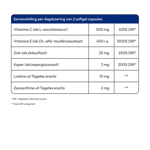 | Vitamine C (als L-ascorbinezuur) | 500 mg (625% DRI*) |