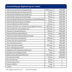 Multivitamine speciaal samengesteld voor senioren. De samenstelling is gebaseerd op de wetenschappelijke inzichten van het Voedingscentrum die speciaal voor een aantal doelgroepen (kinderen, zwangeren en ouderen) een aangepast advies heeft afgegeven.