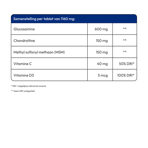 Dit product bevat 2000 mg D-glucosamine sulfaat2KCl, waarvan 1183 mg elementaire glucosamine. Ook bevatten de tabletten chondroïtine en MSM. Chondroïtine komt niet voor in voeding, een chondroïtinerijk dieet bestaat dus niet. Chondroïtine is net als glucosamine een belangrijke bouwsteen van kraakbeen (2). MSM is de afkorting van Methylsulfonylmethaan, een zwavelverbinding die normaal gesproken in het lichaam aanwezig is.