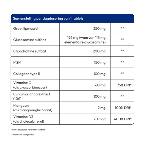 groenlipmossel, glucosamine sulfaat 2KCL, chondroïtine, vulstof (microkristallijne cellulose), MSM, collageen, vitamine C, antiklontermiddel (magnesium stearaat en silicium dioxide), curcuma longa, mangaan, vitamine D3, capsulewand (hypromellose), kleurstof (calciumcarbonaat, ijzeroxide).