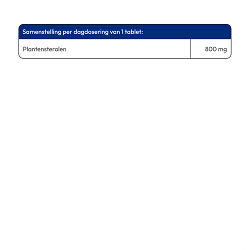 Plantensterolenextract, vulstoffen (microkristallijne cellulose, maïszetmeel, calciumcarbonaat, siliciumdioxide), antiklontermiddel (magnesiumstearaat), coating (hydroxypropylmethylcellulose), bevochtigingsmiddel (glycerol), glansmiddel (bijenwas).