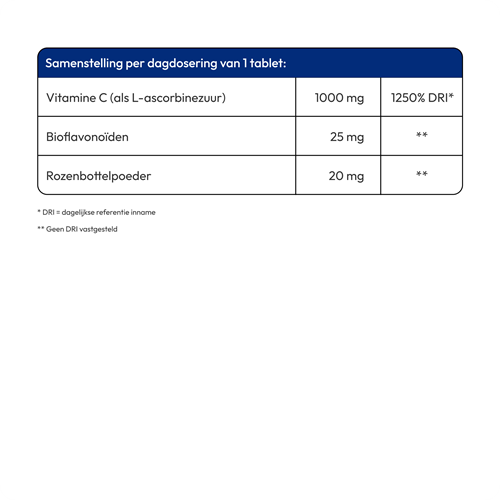 | Vitamine C (als L-ascorbinezuur) | 1000 mg (1250% DRI*) |