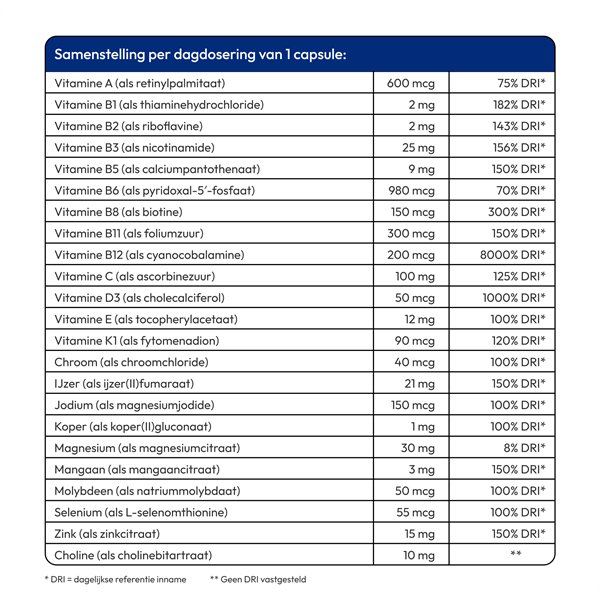 De specifieke samenstelling van deze formule is gebaseerd op de laatste inzichten. Deze samenstelling verschilt aanzienlijk van een gewone multivitamine en is niet inwisselbaar.